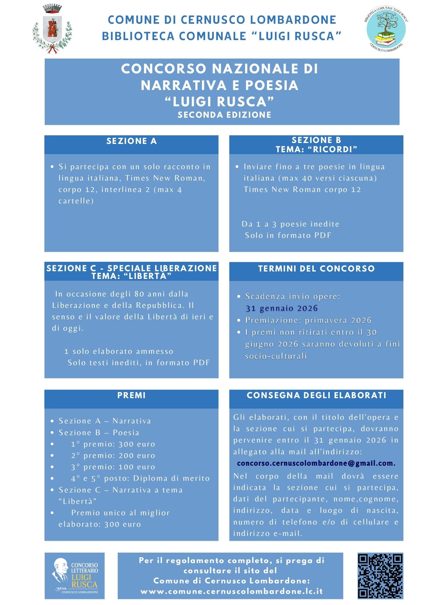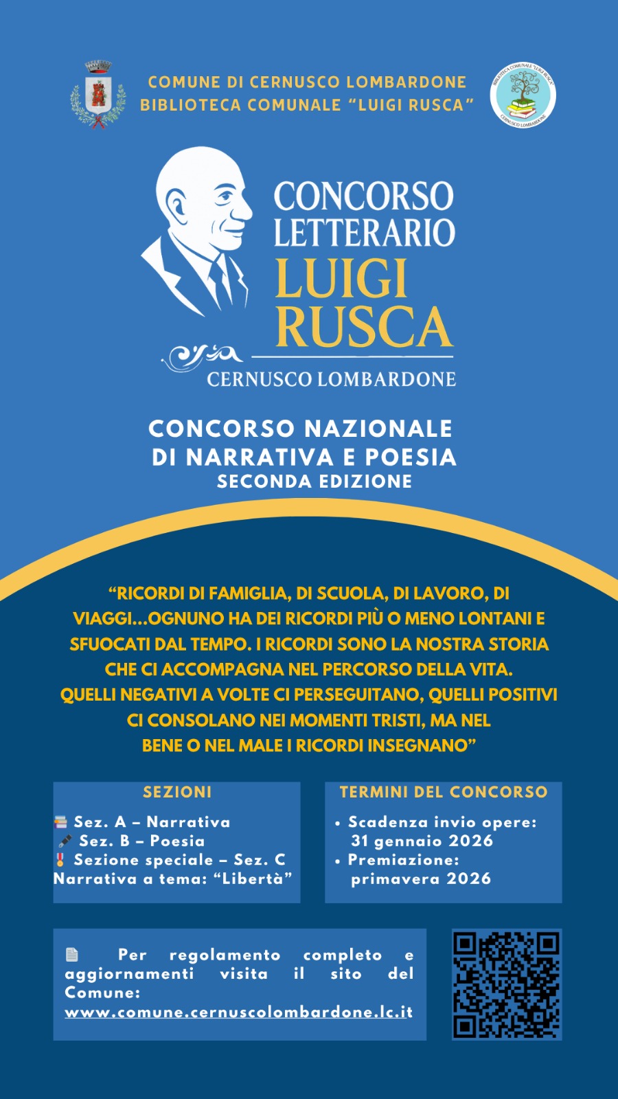 Il Comune di Cernusco Lombardone, in collaborazione con la Commissione Biblioteca, indice il II Concorso nazionale di Narrativa (sez. A) e Poesia (sez. B) "Luigi Rusca" a tema "Ricordi".