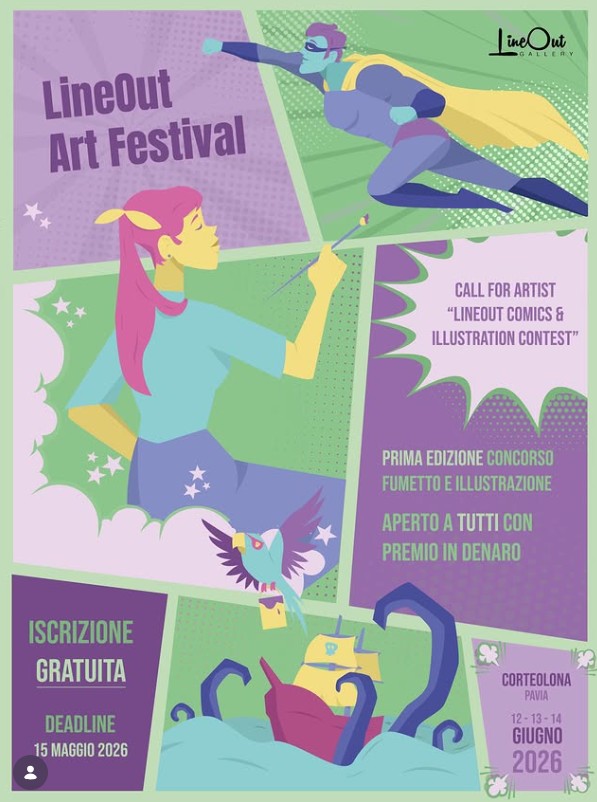 Sono aperte le candidature per il nostro nuovo Contest dedicato all arte del fumetto e l'illustrazione , si chiuderanno il 15 Maggio 2026 , selezioneremo solo 10 finalisti che avranno la possibilità di poter esporre i propri lavori, durante l' evento LINEOUT ART FESTIVAL, PAVIA .